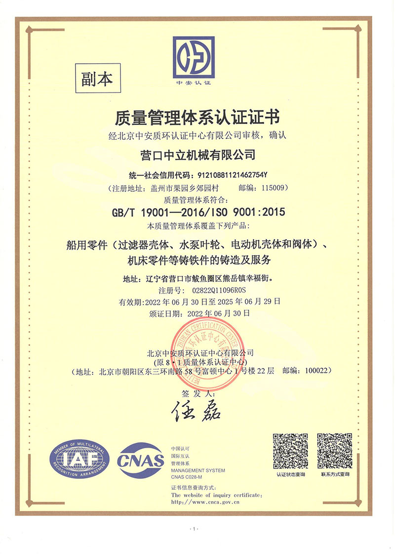 營(yíng)口中立機(jī)械有限公司位于營(yíng)口市鲅魚(yú)圈區(qū)熊岳鎮(zhèn)幸福街,成立于1982年,占地面積15000平方米,建筑面積10000平方米,是從事高性能鑄鐵件生產(chǎn)的專(zhuān)業(yè)廠家。年生產(chǎn)能力5000噸。鑄造采用電爐熔煉呋喃樹(shù)脂砂造型先進(jìn)工藝生產(chǎn),產(chǎn)品具有材質(zhì)性能高、形狀復(fù)雜、尺寸精度、表面美觀等特點(diǎn)。多年來(lái)產(chǎn)品主要出口日本、德國(guó)及英美等國(guó)家,產(chǎn)品種類(lèi)有機(jī)床、電機(jī)、船用閥門(mén)水泵、工程機(jī)械等千余品種鑄件或加工配套產(chǎn)品。